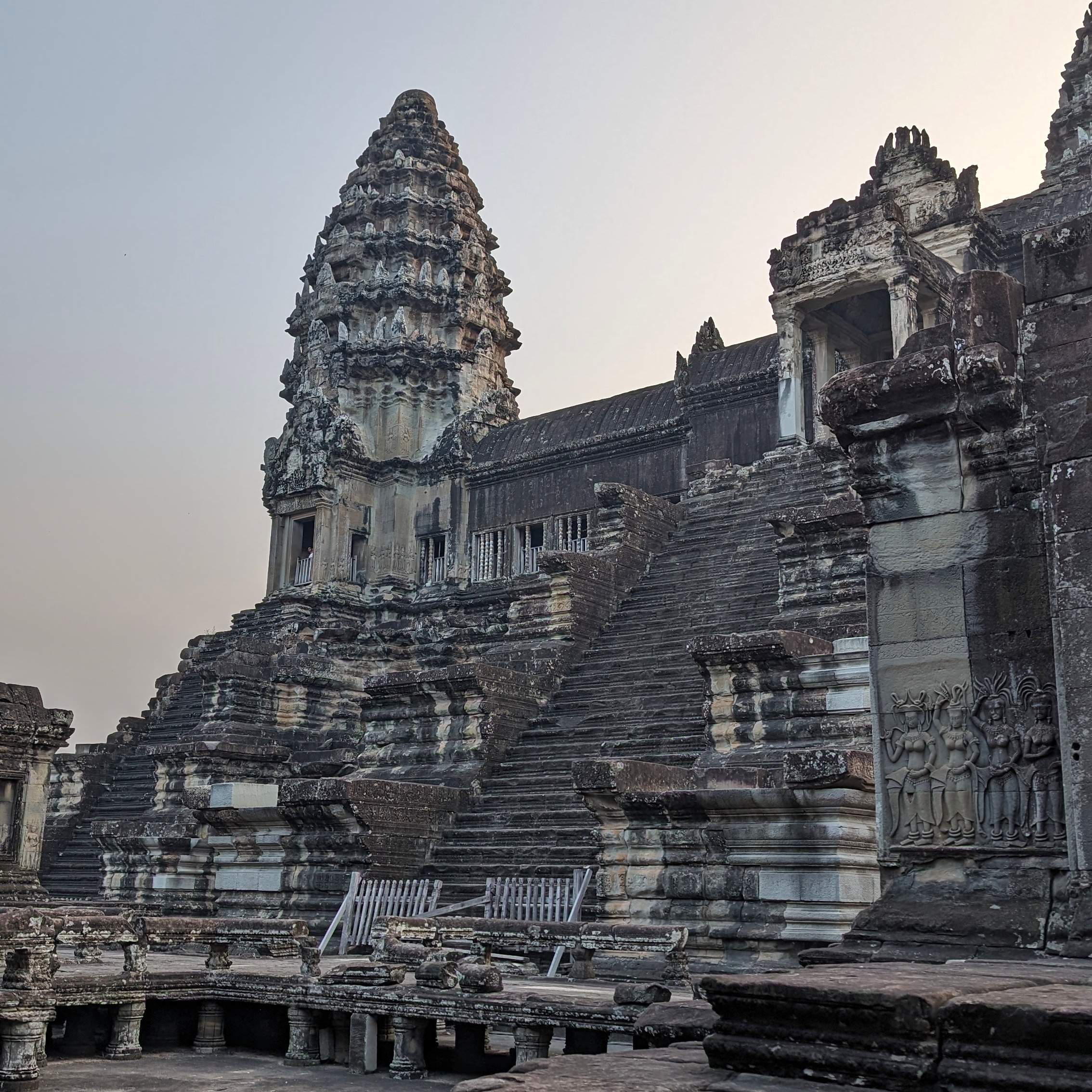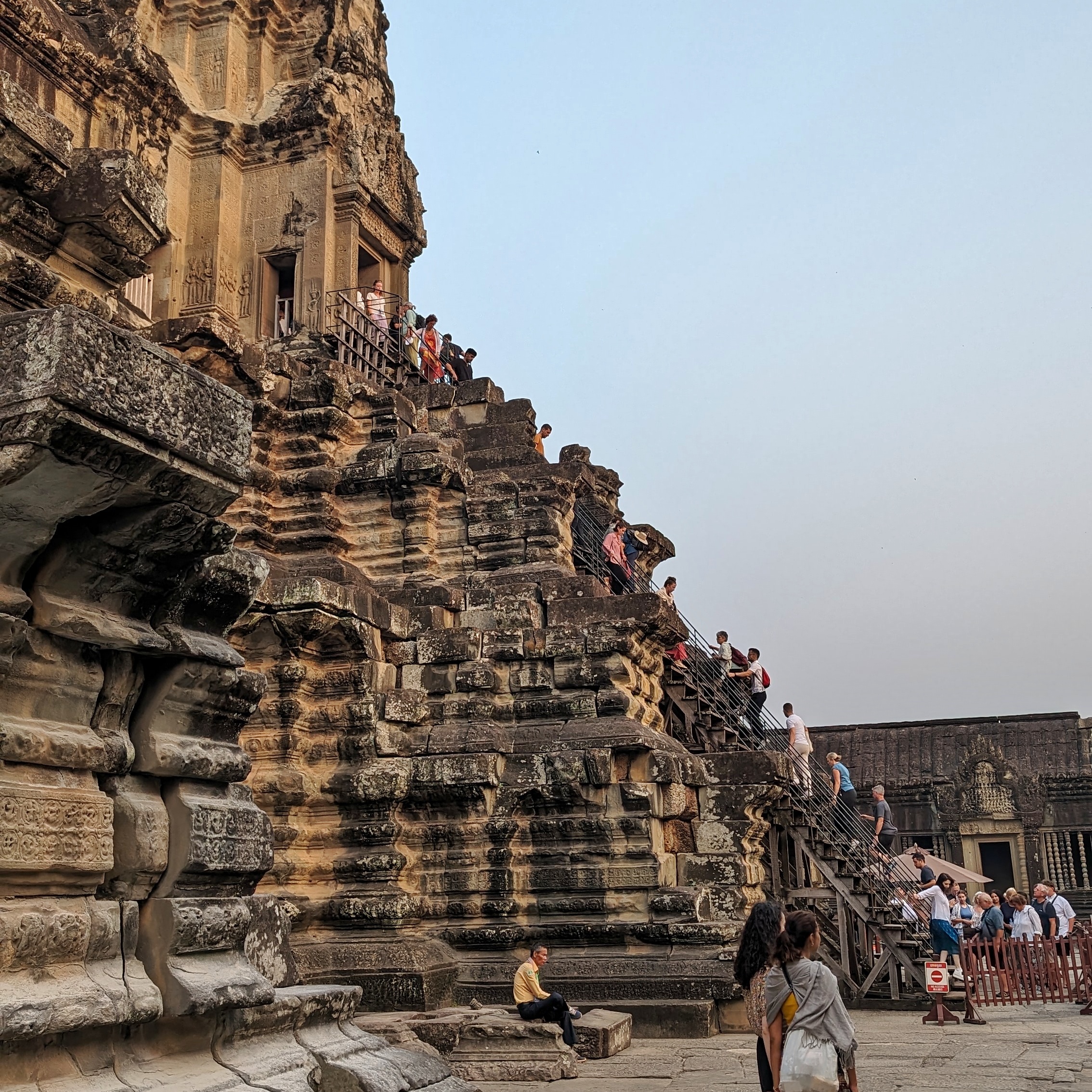 We had a Khmer scholar accompany us on the temple tour, and no Wikipedia page entry (though a tremendously helpful supplement) can substitute the guided explanations from someone so intimately versed in the temple’s story, from its transition from a Hindu to a Buddhist temple and the widespread looting which led to many statues missing their heads and hands to the magnificent Angkor Wat Equinox which happens twice a year. I climbed one of the uppermost temple’s notoriously steep staircases – legend has it that the steps were built steep with a 70-degree incline because paradise is not meant to be easy (and to leave). Both the ascent and descent were heart-pumping affairs, with the latter being a clutch-railing-while-crawling-down-and swearing situation. (Not for the faint-hearted, I tell ya.)