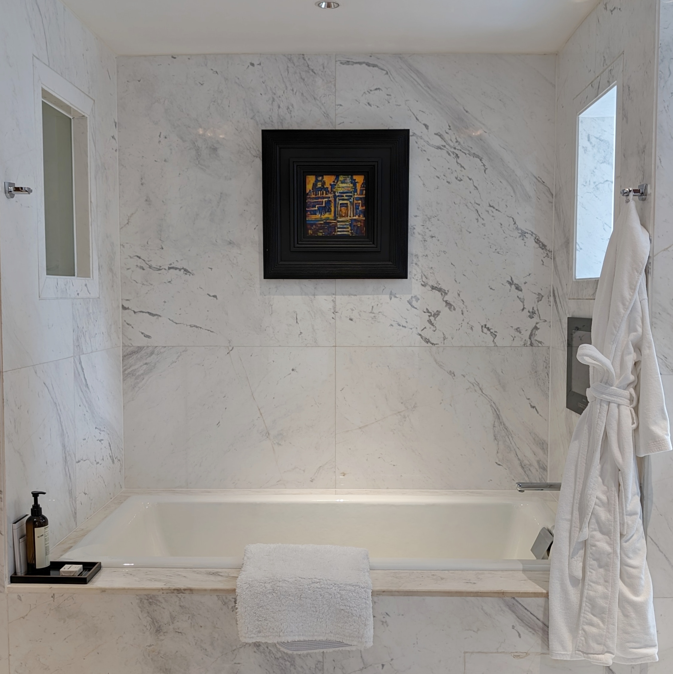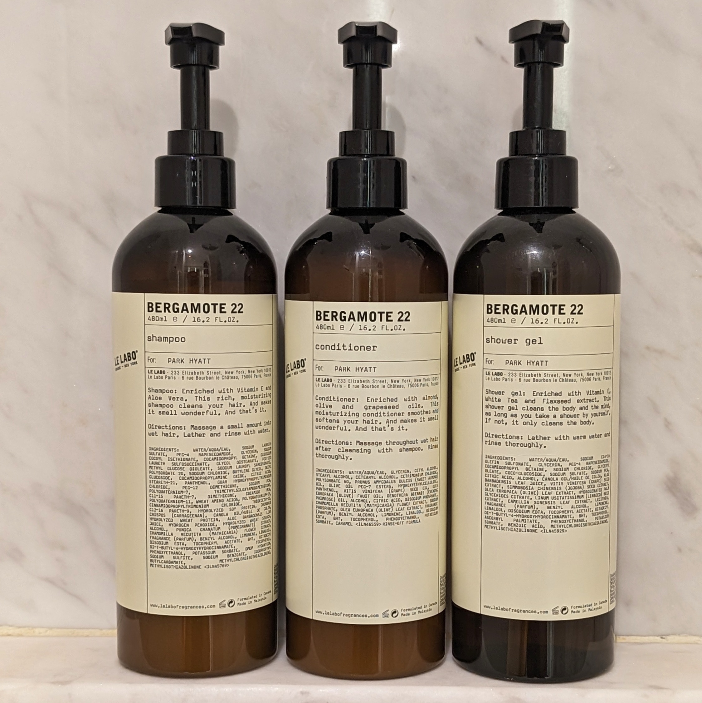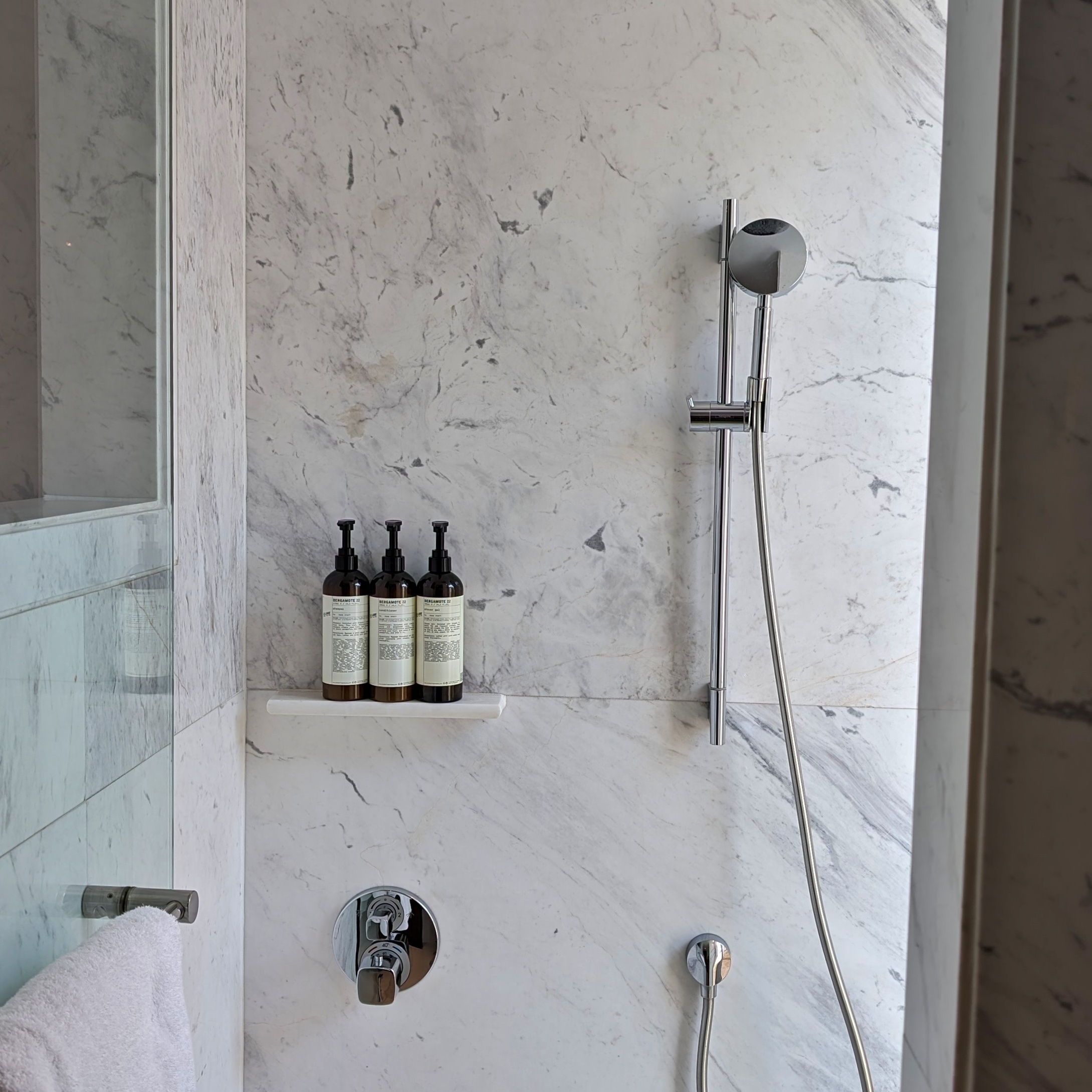 The bathroom offers separate vanities, with an ensuite bathtub and an enclosed rainfall shower area. Bathroom amenities are Bergamote 22-scented from Le Labo.