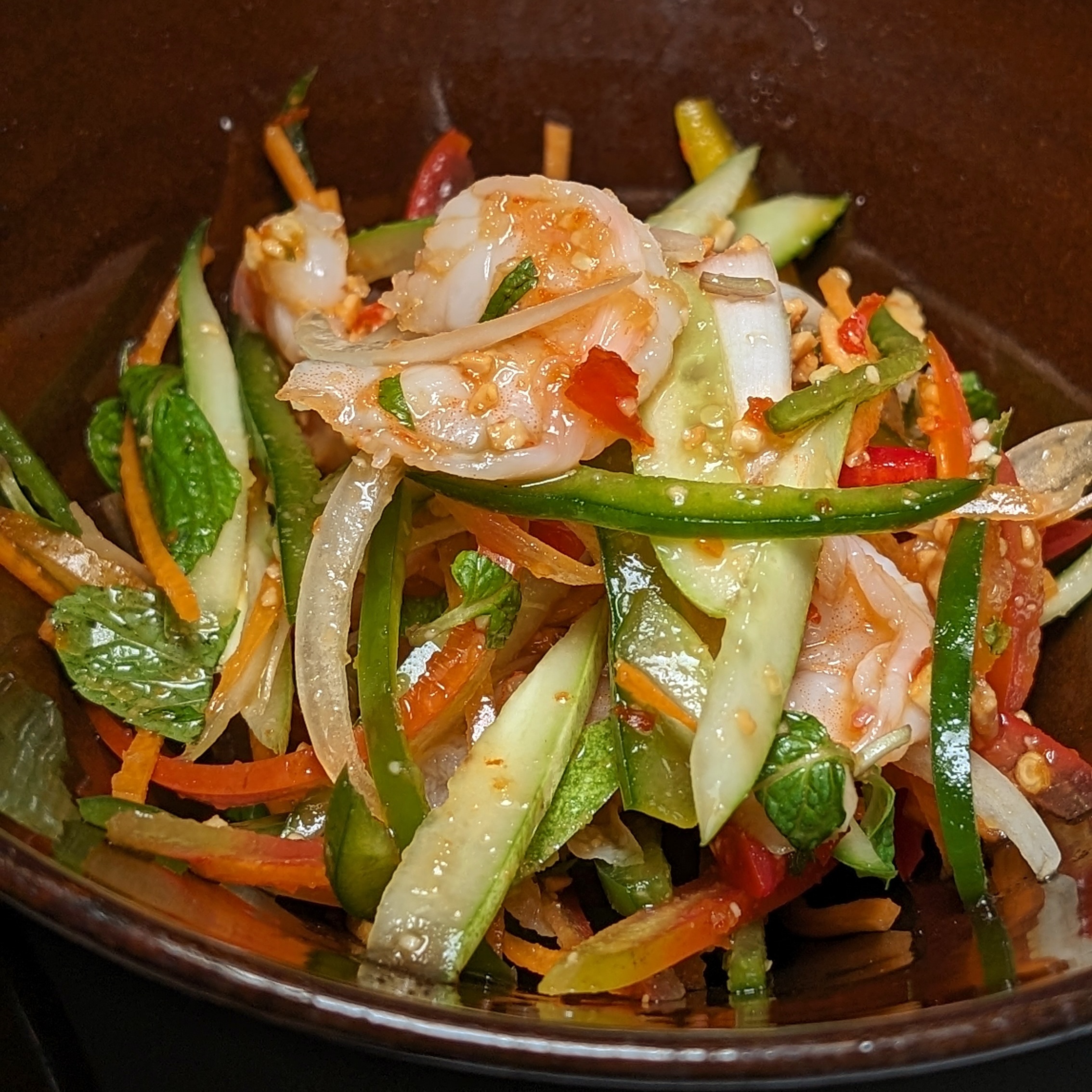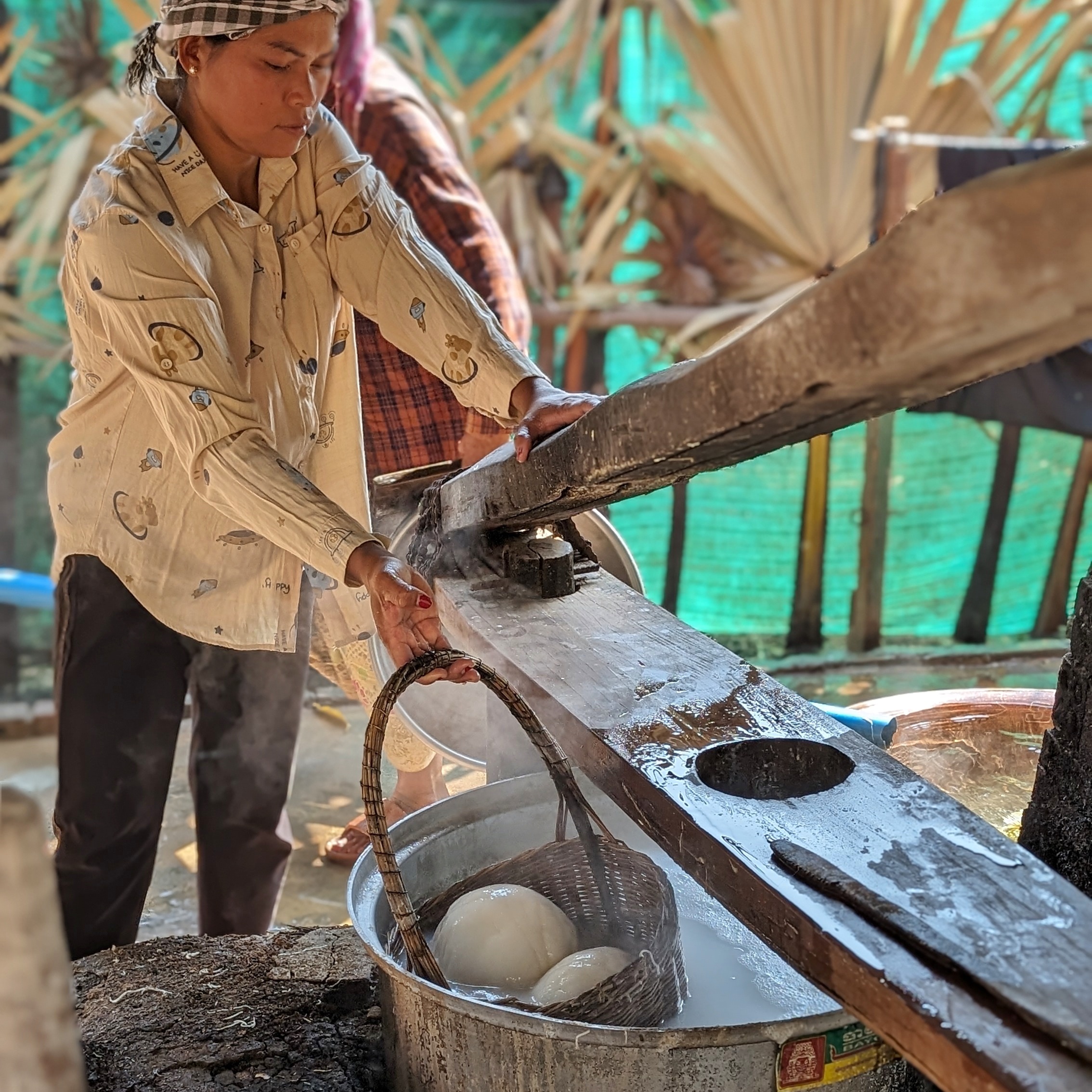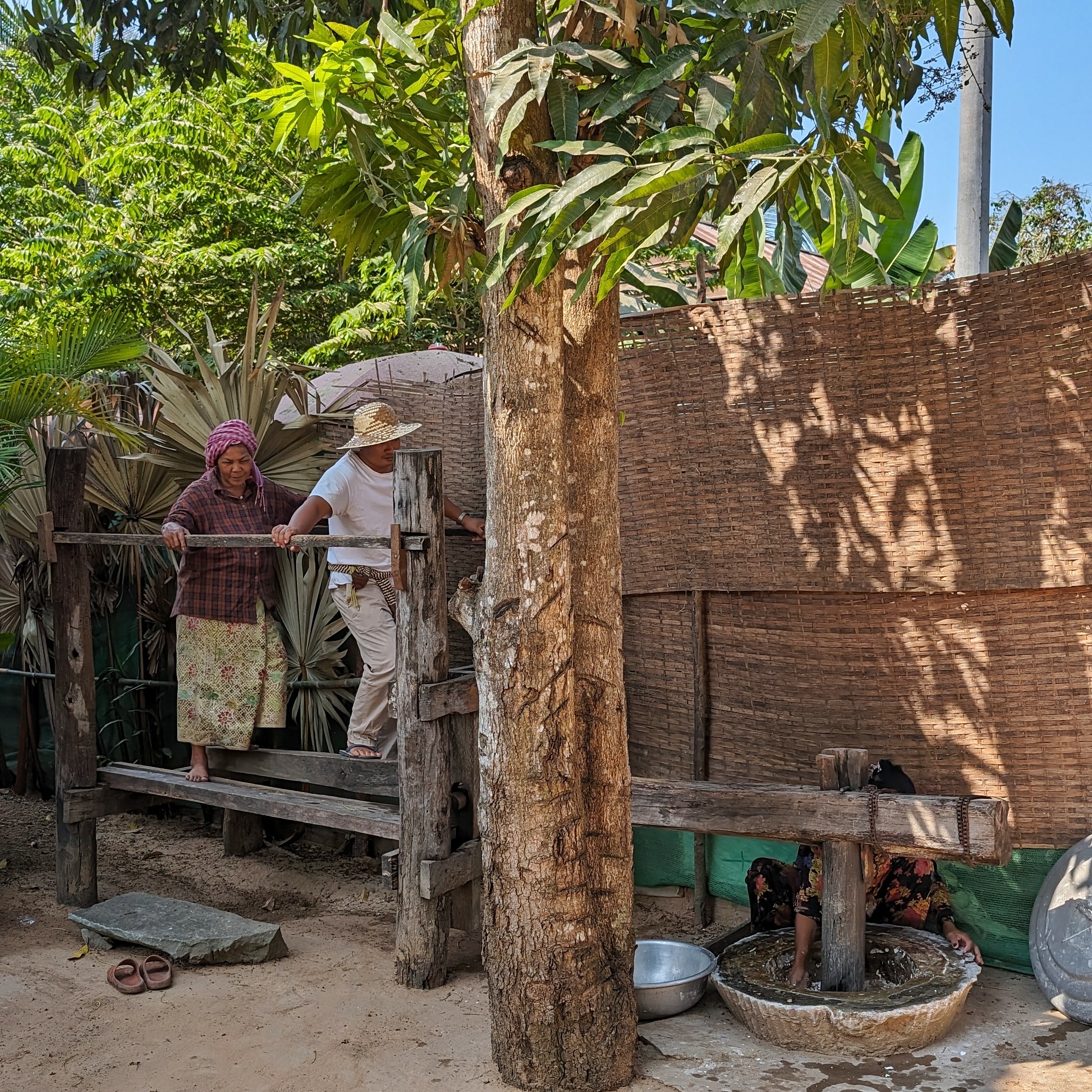 Guided by the hotel’s Executive Chef, Pisith Theam, the “Taste of Cambodia” experience commenced with a quick tour of the Old Market, the oldest Khmer market in Siem Reap where locals shop for fresh vegetables, seafood, and meat. Next, we were driven in a traditional tuk-tuk to the nearby Preasdark Village to a fifth-generation family home where Num Banh Chok (Cambodian rice noodles) are produced using traditional methods. I was invited to try operating a hand-crank stone mill (fantastic cardio, mind), and at some point I found myself sitting on a seesaw-esque wooden cantilevered contraption such that my weight forced a mound of rice dough on the other end of the cantilever through a sieve which was placed over a pot of boiling water.