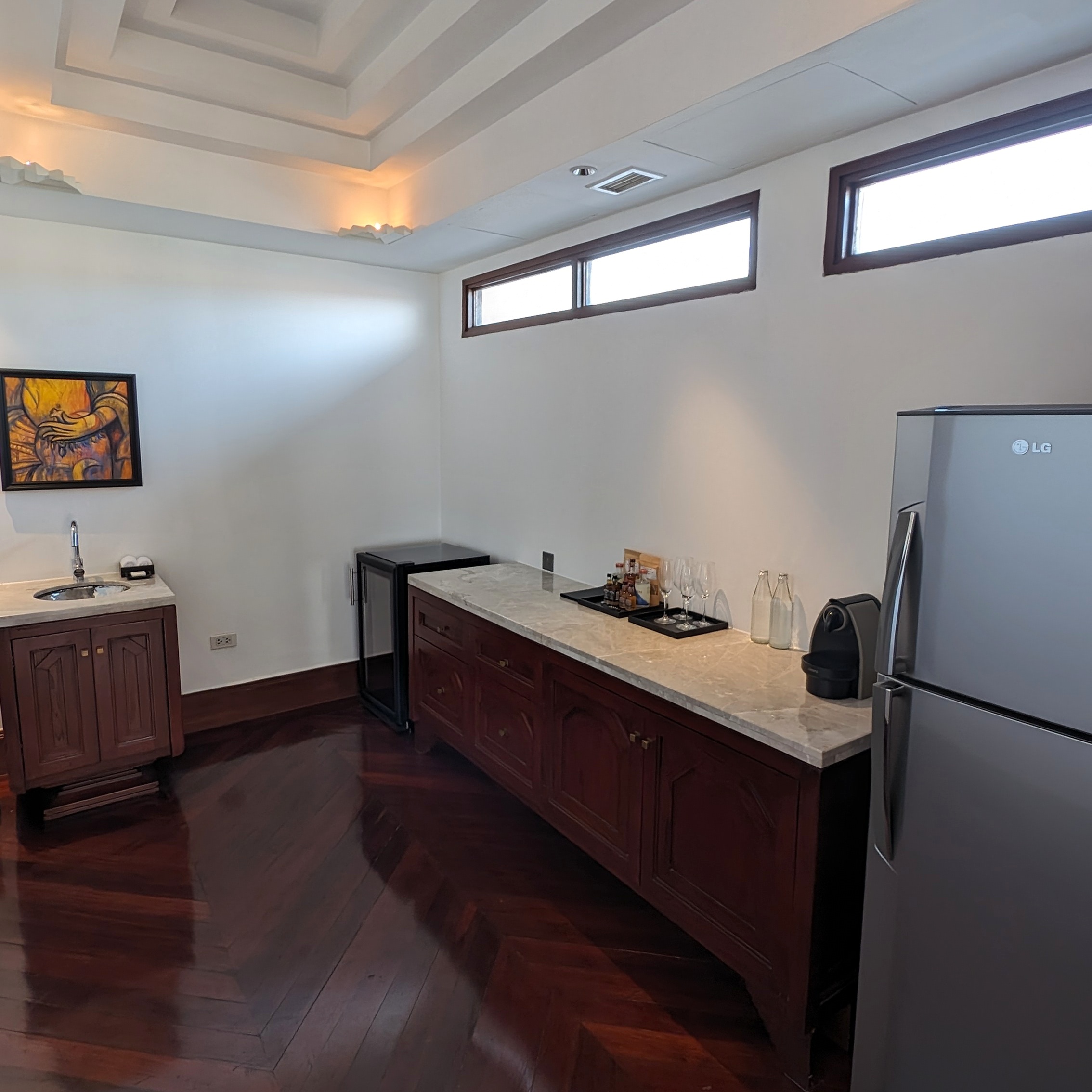 Boasting its own sprawling outdoor garden deck with a sunbed, the 152sqm Rooftop Garden Suite is massive. The living room has a variety of artefects on display for that luxurious residential feel, has a large central sofa area with coffee table that could easily host an international summit, and there is an additional dining table that could double up as a work station. There is a powder room, a kitchen with a pantry, a large refrigerator (this bar ain’t mini) and even a wine fridge. The pantry is stocked with Nespresso coffee and teas from American company Harney & Sons, while the minibar comprises Cambodian spirits such as Seekers Mekong Dry Gin and Vodka as well as Samai Kampot Pepper Rum along with bottled beers and beverages.