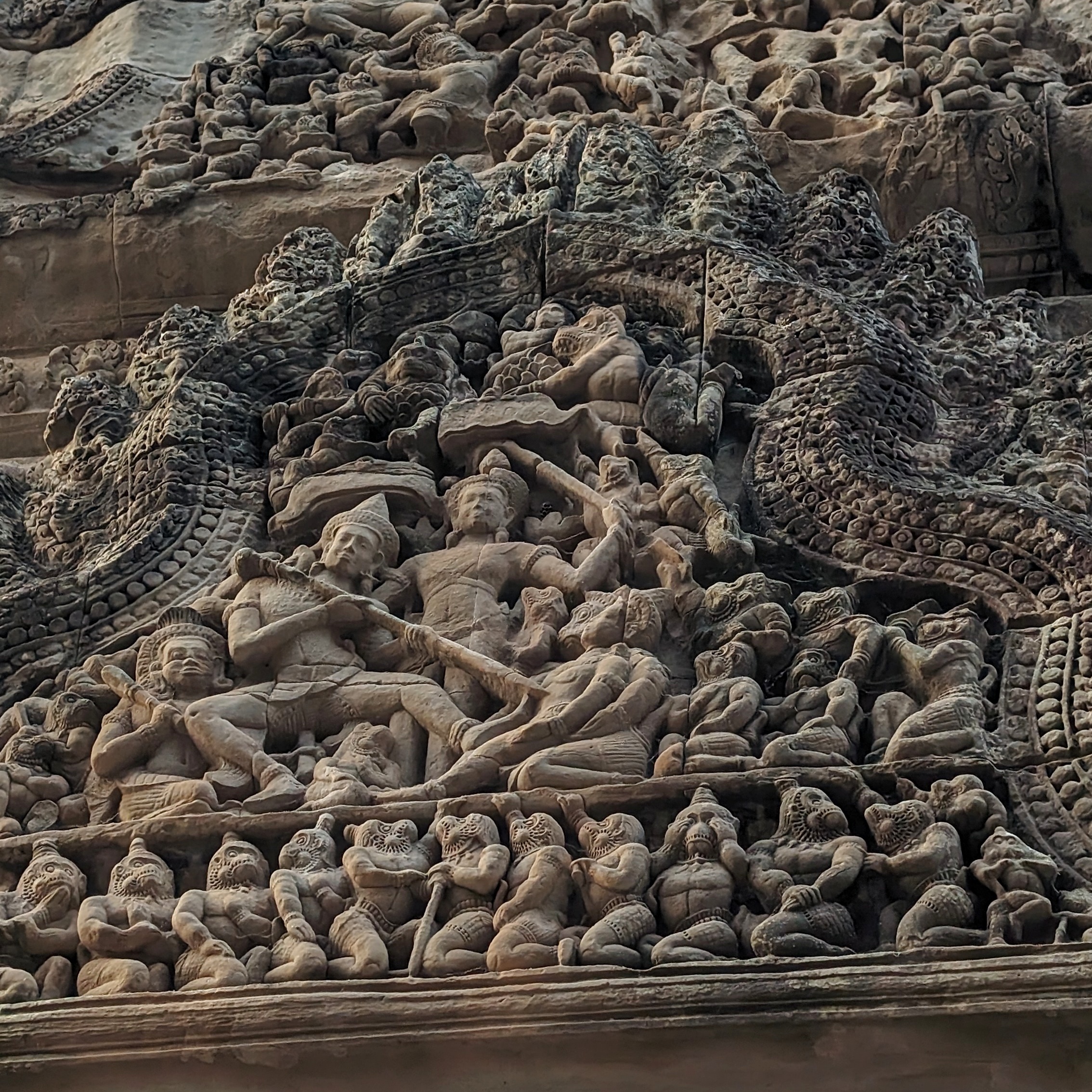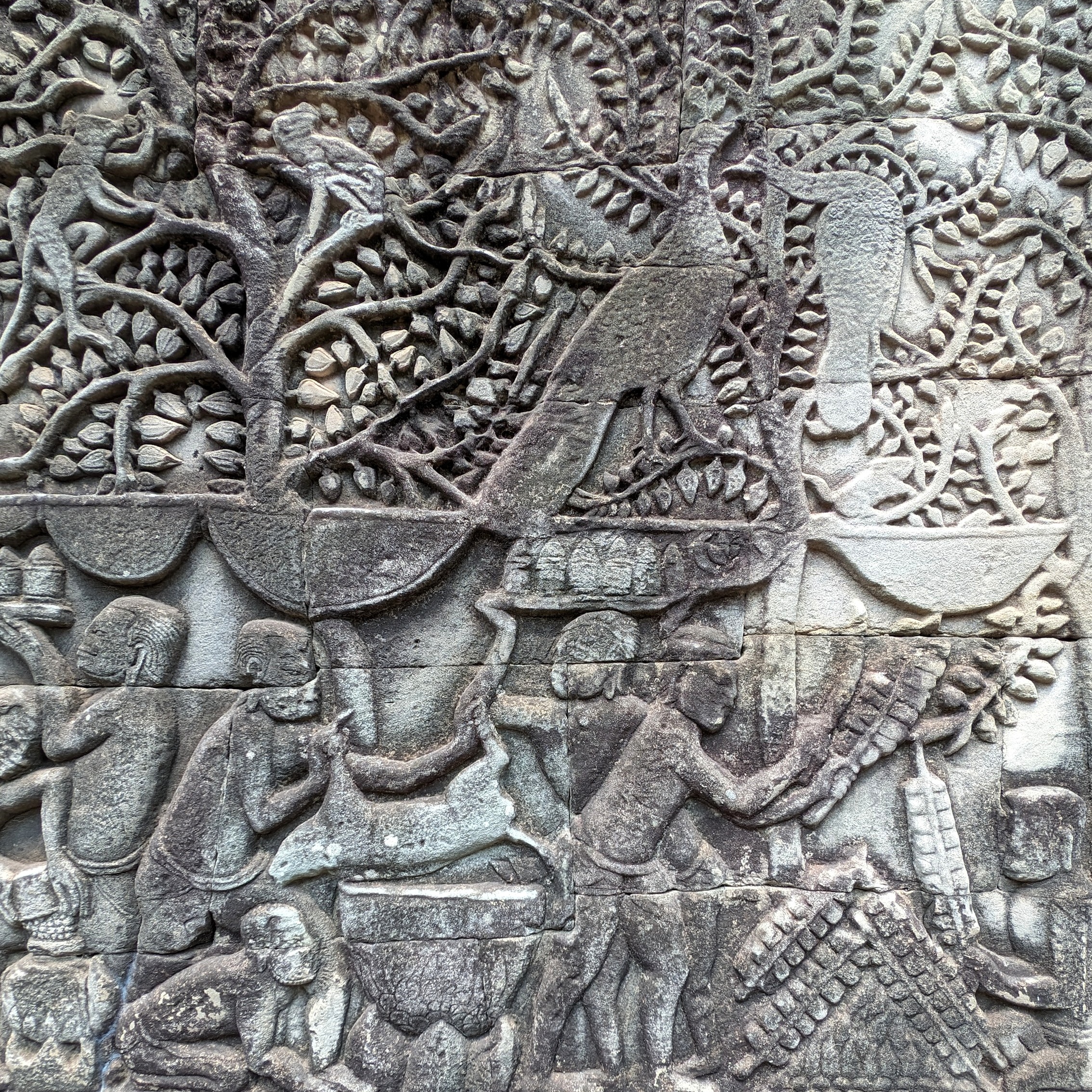 After a short break back at the hotel for breakfast and a rejuvenating shower, the Full-day Angkor Wat Experience resumes. The next stop was the Bayon Temple, which is set in the heart of Angkor Thom, the capital city of the Khmer Empire. The Bayon Temple is quite the intriguing, mysterious structure from afar, comprising 216 large, enigmatic smiling faces on the sides of the temple’s various towers. I was particularly drawn to the tall walls of the temple’s outer gallery, the entire length of which showcases sculpted depictions of historical events and scenes from the Angkorian Khmer era – think Chinese merchants at work (yes, you can tell they are Chinese); a naval battle on the Tonle Sap between Khmer and Cham forces; village life consisting of open-air market trade, pig slaughter and grilling skewers (!); animals in a forest; and even a cockfight. (My Park Executive Suite has on its wall an artwork featuring a reproduction of some of the above-mentioned scenes.)