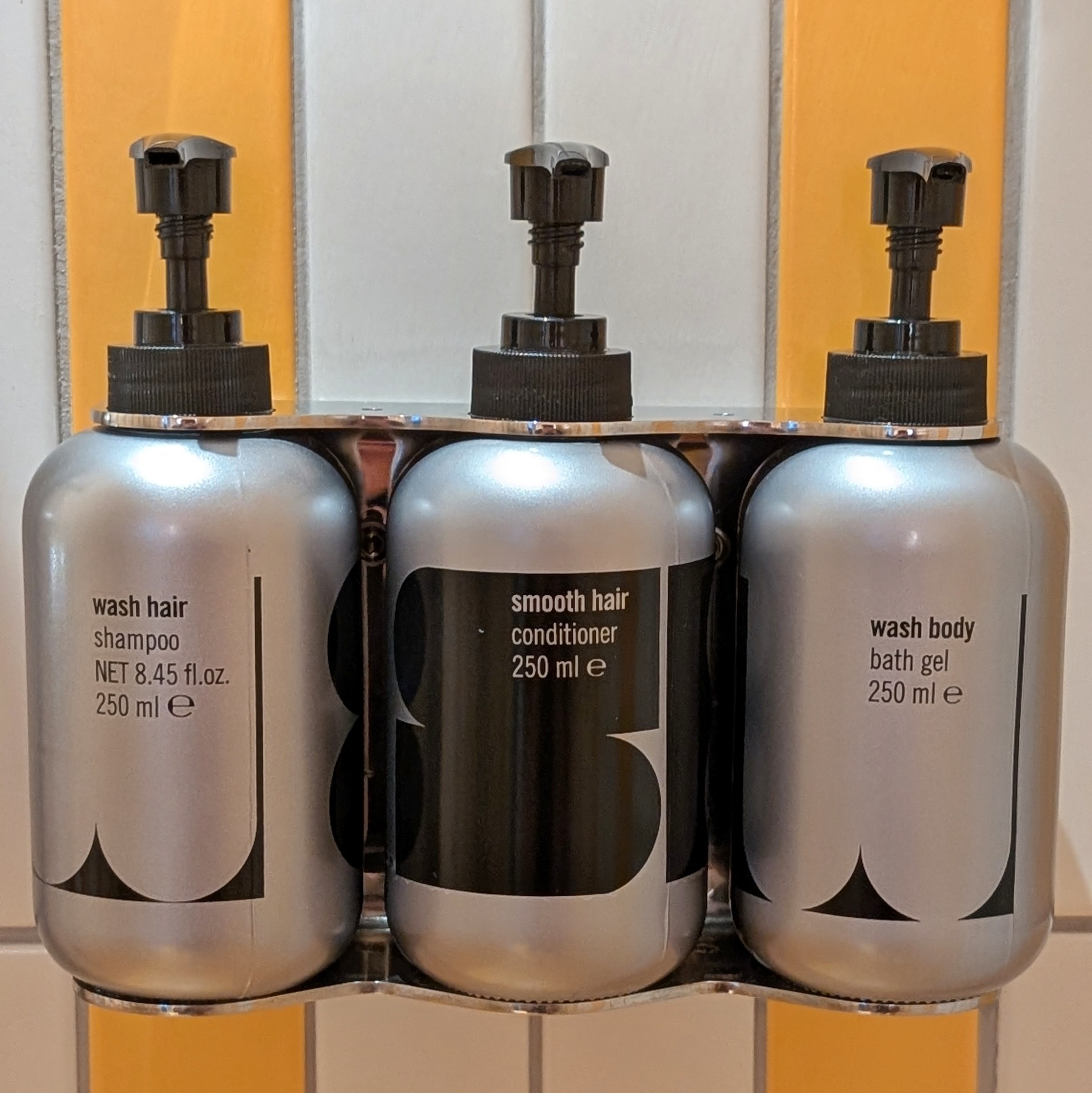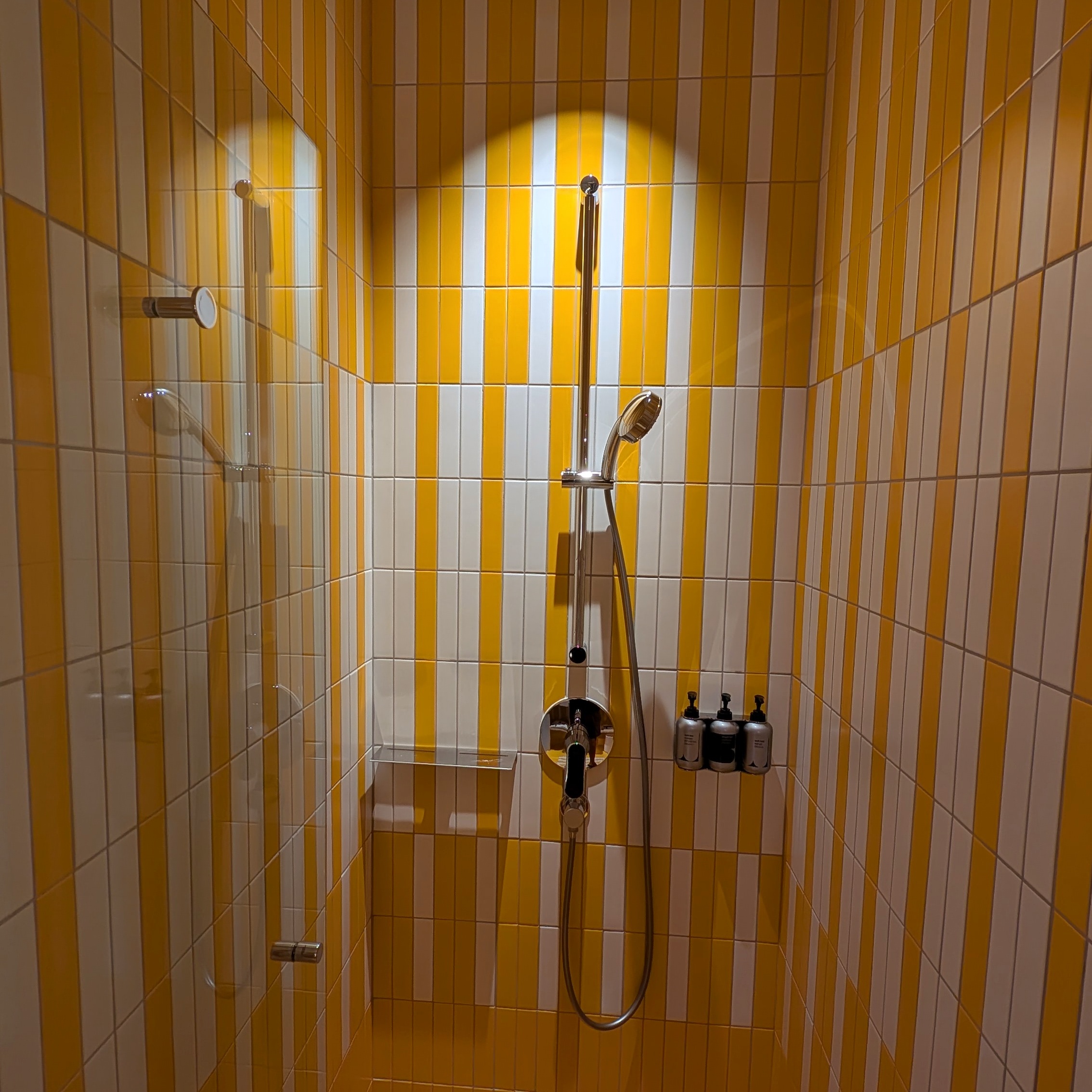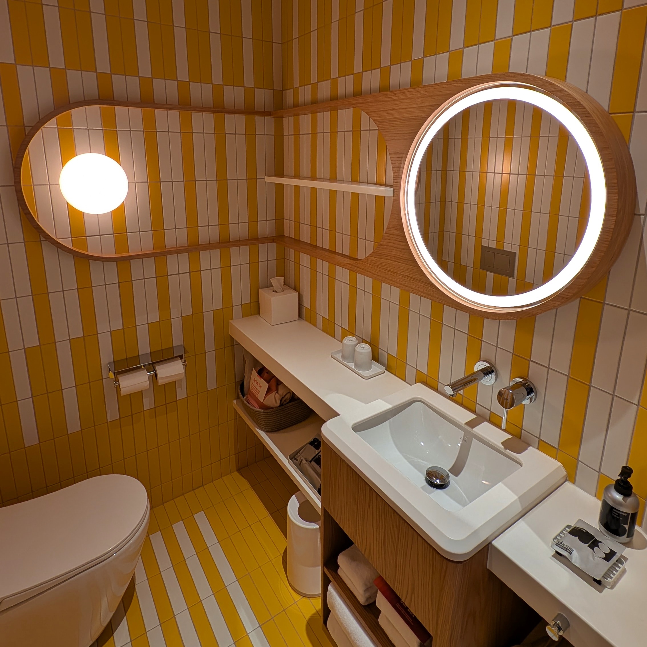 The bathroom boasts sunshine-yellow tiled walls that give the space a cheery, McDonald’s-esque diner vibe, while a spacious rainfall shower space offers amenities from Italian skincare brand Davines in wall pump bottles.