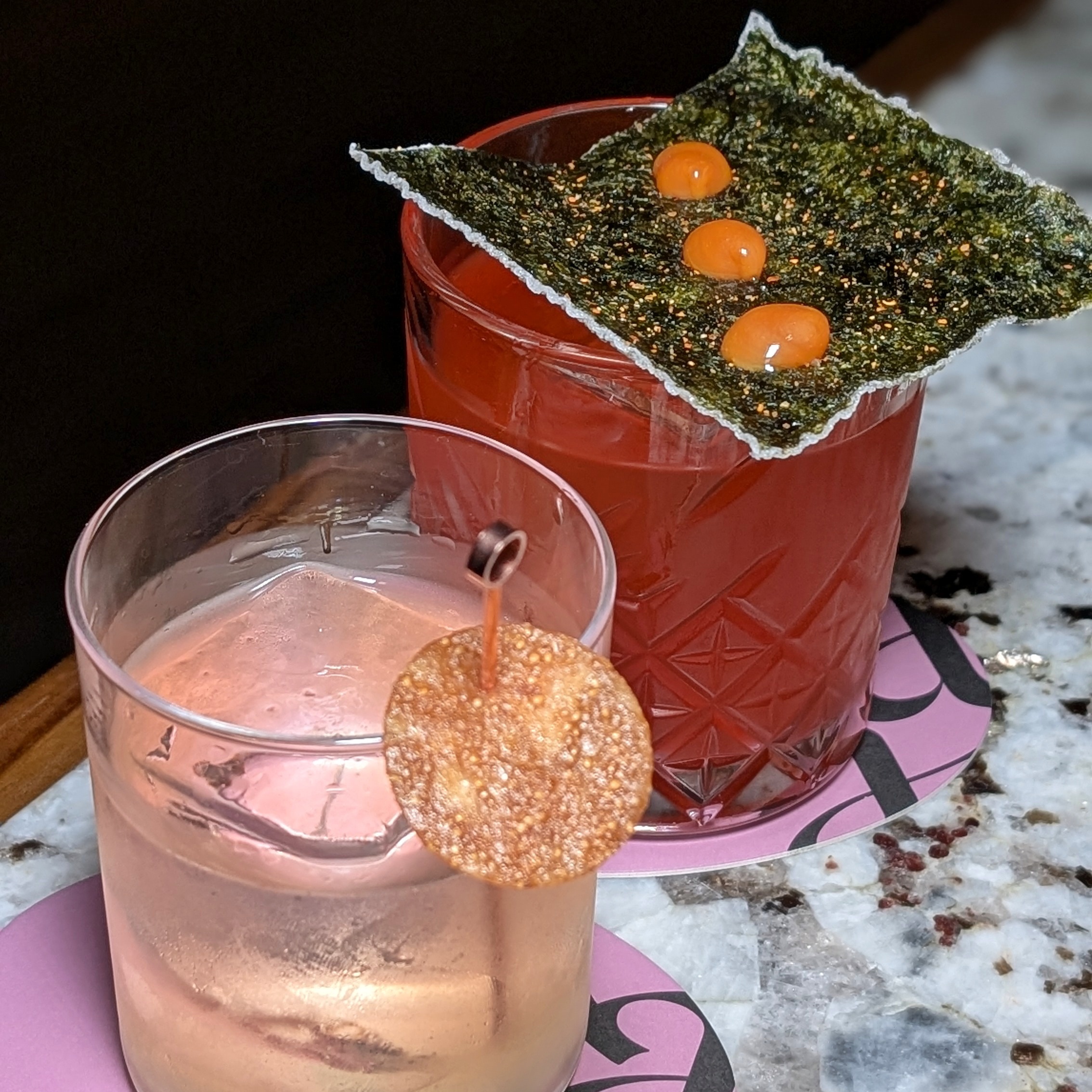 The adjacent Kaya Bar serves a variety of Japanese-inspired cocktails, from the heady Shizuka-tini (sakura tea-infused Roku Gin, chrysanthemum-infused vermouth, earl grey tincture) and ginger-tinged Seikatsu Fashioned (The Hachi Sochu Mugi, plum umeshu, house-made pickled ginger syrup, house-made fig shrub, umami bitters, saline, zero-waste fig leather) to the spicy Takuya Mary (tomato-infused Tito’s, mirin, soy sauce, house made osmanthus honey, fire water, nori crisp with dashi carrot gel) and the dessert bonanza Wagashi Harmony (milk oolong-infused Suntory Whisky, NOBO coconut milk, matcha, hojicha, house-made black sesame syrup).